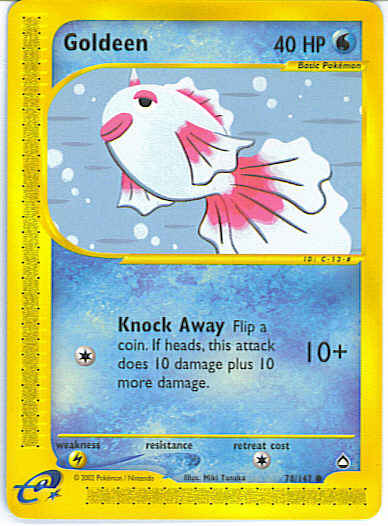 Type | Water | Pokemon serie | Aquapolis | Stadie | Basic | HP | 40 | Sjældenhed | Common | Tilbagetrækning | 1 | Svaghed | L | Kortnummer | 78 | Evne | [C] Knock Away (10+) Flip a coin. If heads, this attack does 10 damage plus 10 more damage.