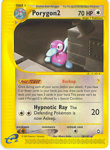 Type | Colorless | Pokemon serie | Aquapolis | Stadie | Stage 1 | HP | 70 | Sjældenhed | Rare | Tilbagetrækning | 1 | Svaghed | F | Kortnummer | 28 | Evne | [CC] Hypnotic Ray (20) The Defending Pokemon is now Asleep.
