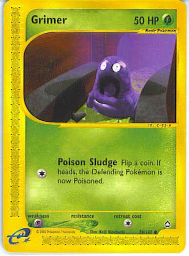 Type | Grass | Pokemon serie | Aquapolis | Stadie | Basic | HP | 50 | Sjældenhed | Common | Tilbagetrækning | 1 | Svaghed | P | Kortnummer | 79 | Evne | [C] Poison Sludge - Flip a coin. If heads, the Defending Pokemon is now Poisoned.