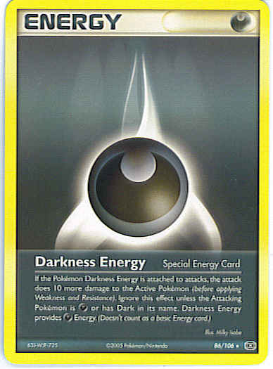 Evne If the Pokemon Darkness Energy is attached to attacks, the attack does 10 more damage to the Active Pokemon (before applying Weakness and Resistance). Ignore this effect unless the Attacking Pokemon is D or has Dark in its name. Darkness Energy provides D energy. (Doesn't count as a basic Energy card.)
