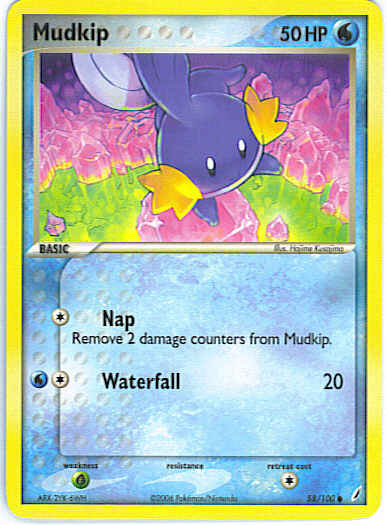 Type | Water | Pokemon serie | Crystal Guardians | Stadie | Basic | HP | 50 | Sjældenhed | Common | Tilbagetrækning | 1 | Svaghed | G | Kortnummer | 58 | Evne | [C] Nap - Remove 2 damage counters from Mudkip. [CW] Waterfall (20) | Evne2 | [C] Nap - Remove 2 damage counters from Mudkip. [CW] Waterfall (20) | Kunstner | Hajime Kusajima |