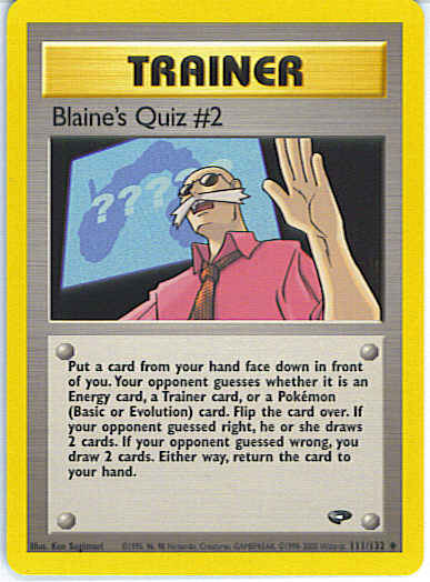 Put a card from your hand face down in front of you. Your opponent guesses whether it is an Energy card, a Trainer card, or a Pokemon (Basic or Evolution) card. Flip the card over. If your opponent guessed right, he or she draws 2 cards. If your opponent guessed wrong, you draw 2 cards. Either way, return the card to your hand.