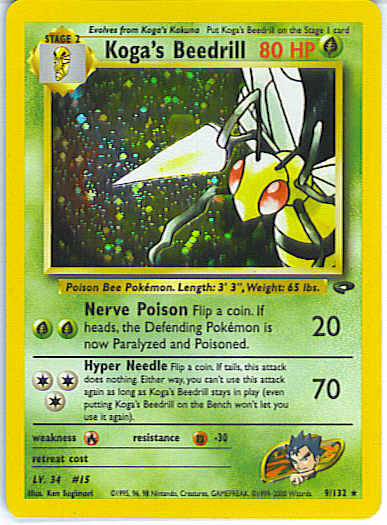 [CCC] Hyper Needle (70) Flip a coin. If tails, this attack does nothing. Either way, you can't use this attack again as long as Koga's Beedrill stays in play (even putting Koga's Beedrill on the Bench won't let you use it again).