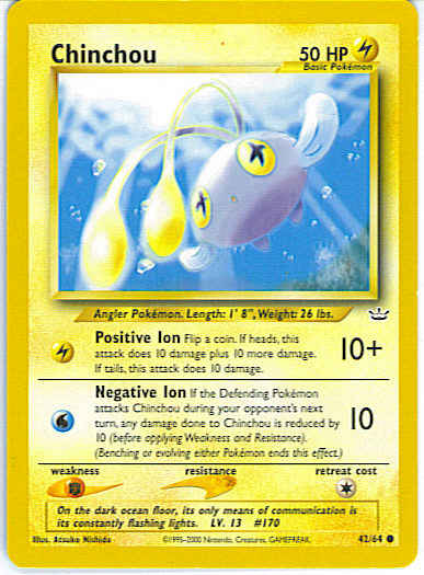 [W] Negative Ion (10) If the Defending Pokemon attacks Chinchou during your opponent's next turn, any damage done to Chinchou is reduced by 10 (before applying Weakness and Resistance). (Benching either Pokemon ends this effect.)