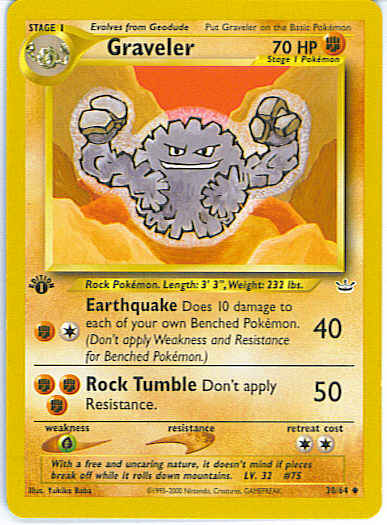 Type | Fighting | Pokemon serie | Neo Revelation | Stadie | Stage 1 | HP | 70 | Sjældenhed | Uncommon | Tilbagetrækning | 2 | Svaghed | G | Kortnummer | 30 | Evne |