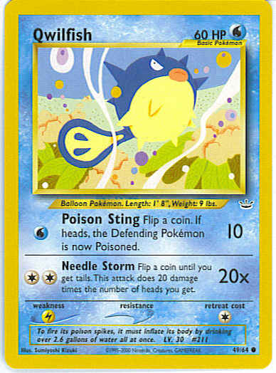 Type | Water | Pokemon serie | Neo Revelation | Stadie | Basic | HP | 60 | Sjældenhed | Common | Tilbagetrækning | 1 | Svaghed | L | Kortnummer | 49 | Evne |