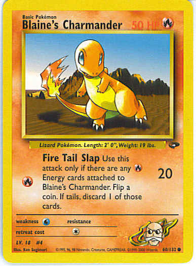 [R] Fire Tail Slap (20) Use this attack only if there are any R Energy cards attached to Blaine's Charmander. Flip a coin. If tails, discard 1 of those cards.