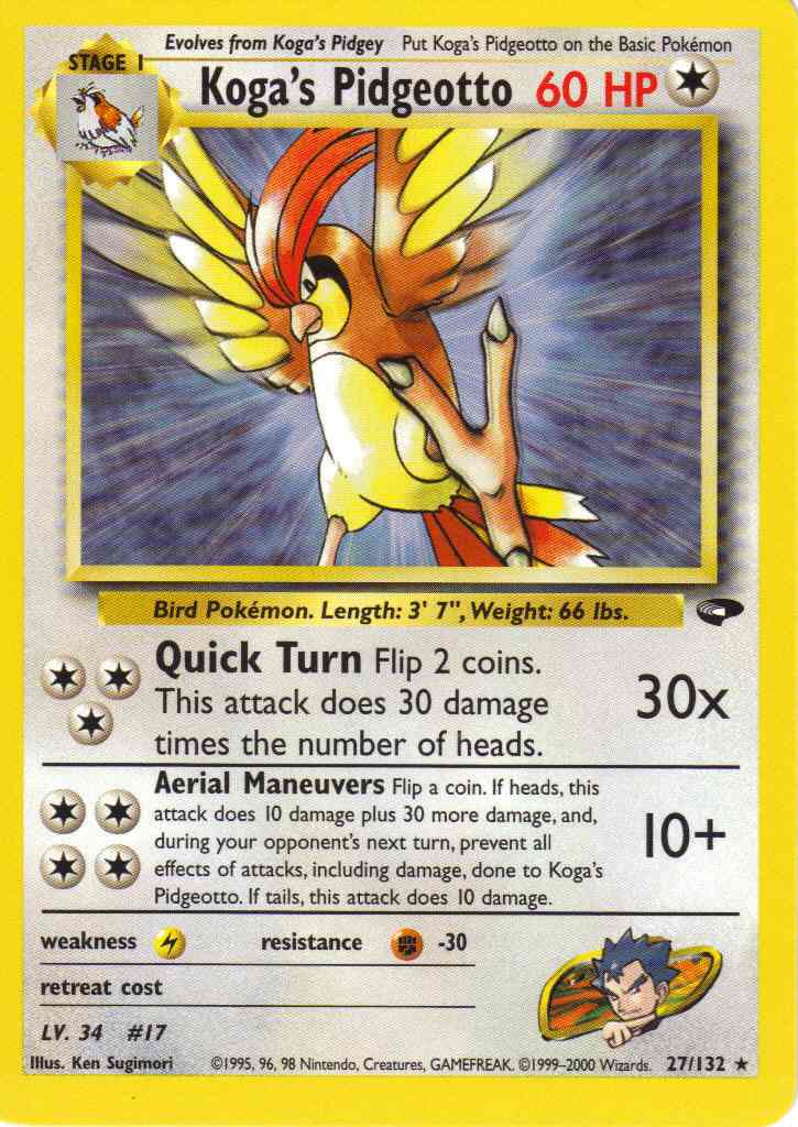 [CCCC] Aerial Maneuvers (10+) Flip a coin. If heads, this attack does 10 damage plus 30 more damage, and, during your opponent's next turn, prevent all effects of attacks, including damage, done to Koga's Pidgeotto. If tails, this attack does 10 damage.