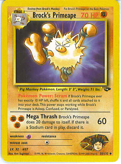 [FFF] Mega Thrash (60) Brock's Primeape does 20 damage to itself. If there is a Stadium card in play, discard it.