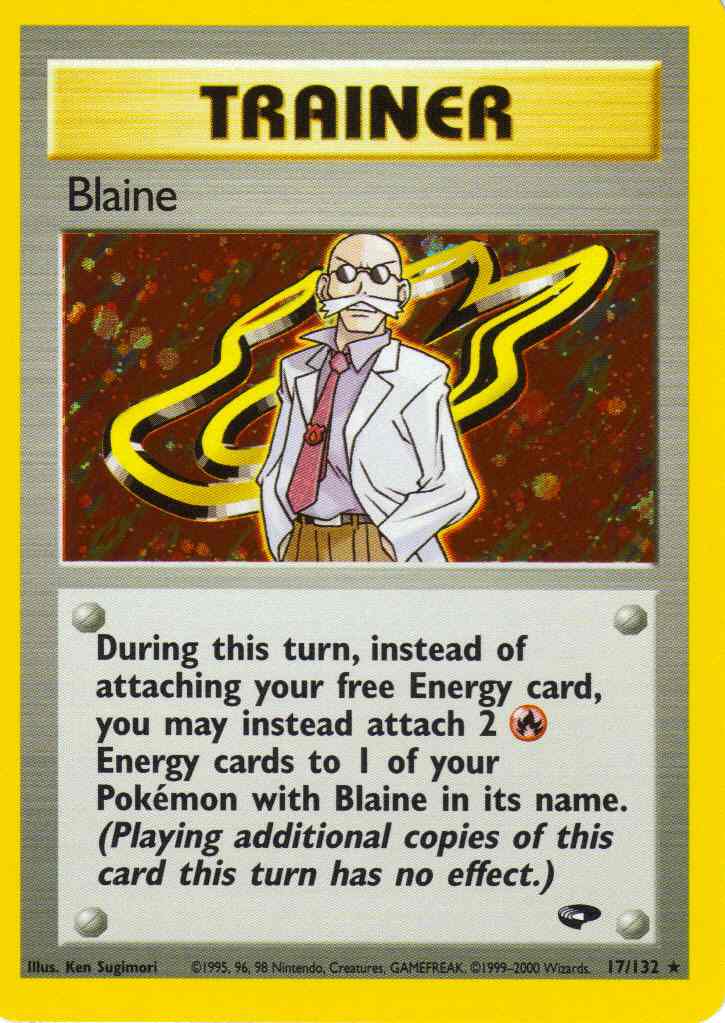 During this turn, instead of attaching your free Energy card, you may instead attach 2 R Energy cards to 1 of your Pokemon with Blaine in its name. (Playing additional copies of this card this turn has no effect.)