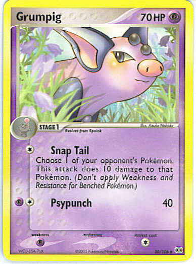 Type | Psychic | Pokemon serie | Emerald | Stadie | Stage 1 | HP | 70 | Sjældenhed | Uncommon | Tilbagetrækning | 1 | Svaghed | P | Kortnummer | 30 | Evne | [C] Snap Tail - Choose 1 of your opponent's Pokemon. This attack does 10 damage to that Pokemon. (Don't apply Weakness and Resistance for Benched Pokemon.) [CP] Psypunch (40) | Evne2 | [C] Snap Tail - Choose 1 of your opponent's Pokemon. This attack does 10 damage to that Pokemon. (Don't apply Weakness and Resistance for Benched Pokemon.) [CP] Psypunch (40) | Kunstner | Atsuko Nishida |