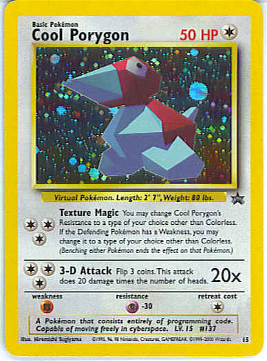 [CCC] Texture Magic - You may change Cool Porygon's Resistance to a type of your choice other than Colorless. If the Defending Pokemon has a Weakness, you may change it to a type of your choice other than Colorless. (Benching either Pokemon ends the effect on that Pokemon.)