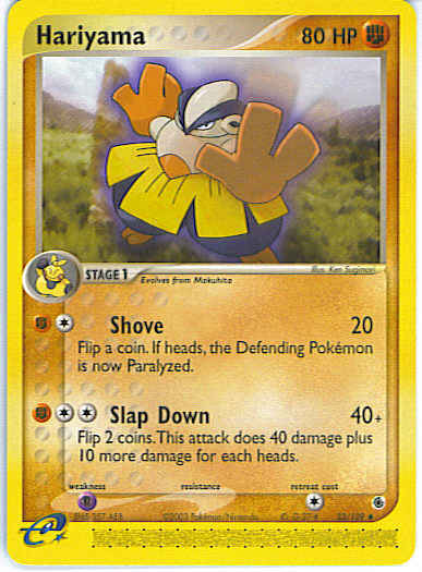 Type | Fighting | Pokemon serie | Ruby Sapphire | Stadie | Stage 1 | HP | 80 | Sjældenhed | Uncommon | Tilbagetrækning | 1 | Svaghed | P | Kortnummer | 33 | Evne | [CF] Shove (20) Flip a coin. If heads, the Defending Pokemon is now Paralyzed. [CCF] Slap Down (40+) Flip 2 coins. This attack does 40 damage plus 10 more damage for each heads.