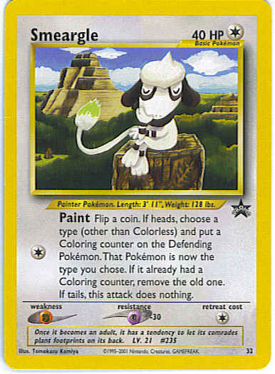 [C] Paint - Flip a coin. If heads, choose a type (other than colorless) and put a Coloring counter on the Defending Pokemon. That Pokemon is now the type you choose. If it already had a Coloring counter, remove the old one. If tails, this attack does nothing.