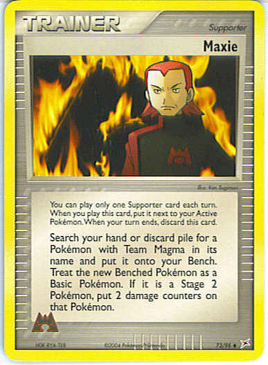 Type | Trainer | Pokemon serie | Team Aqua-Team Magma | Stadie | Trainer (Supporter) | Sjældenhed | Uncommon | Kortnummer | 73 | Evne | Search your hand or discard pile for a Pokemon with Team Magma in its name and put it onto your Bench. Treat the new Benched Pokemon as a Basic Pokemon. If it is a Stage 2 Pokemon, put 2 damage counters on that Pokemon.