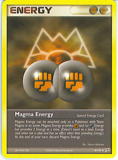 Type | Energy | Pokemon serie | Team Aqua-Team Magma | Stadie | Special Energy | Sjældenhed | Uncommon | Kortnummer | 87 | Evne | Magma Energy can be attached only to a Pokemon with Team Magma in its name. Magma Energy provides F and D Energy but provides 2 Energy at a time. (Doesn't count as a basic Energy card when not in play and has no effect other than providing Energy.) At the end of your turn, discard Magma Energy.