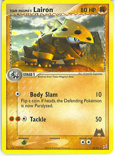 Type | Fighting | Pokemon serie | Team Aqua-Team Magma | Stadie | Stage 1 | HP | 80 | Sjældenhed | Rare | Tilbagetrækning | 2 | Svaghed | G | Kortnummer | 20 | Evne | [C] Body Slam (10) Flip a coin. If heads, the Defending Pokemon is now Paralyzed. [CFF] Tackle (50)