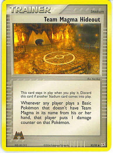 Type | Trainer | Pokemon serie | Team Aqua-Team Magma | Stadie | Trainer (Stadium) | Sjældenhed | Uncommon | Kortnummer | 83 | Evne | Whenever any player plays a Basic Pokemon that doesn't have Team Magma in its name from his or her hand, that player puts 1 damage counter on that Pokemon.