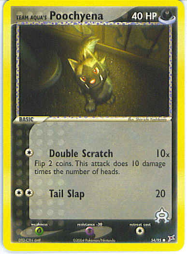 Type | Darkness | Pokemon serie | Team Aqua-Team Magma | Stadie | Basic | HP | 40 | Sjældenhed | Common | Tilbagetrækning | 1 | Modstand | P | Svaghed | G | Kortnummer | 54 | Evne | [C] Double Scratch (10x) Flip 2 coins. This attack does 10 damage times the number of heads. [CC] Tail Slap (20)