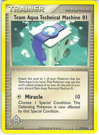 Type | Trainer | Pokemon serie | Team Aqua-Team Magma | Stadie | Trainer (Technical Machine) | Sjældenhed | Uncommon | Kortnummer | 79 | Evne | [C] Miracle (10) Choose 1 Special Condition. The Defending Pokemon is now affected by that Special Condition.