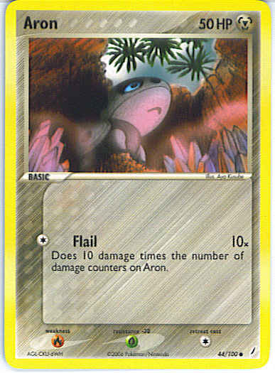Type | Metal | Pokemon serie | Crystal Guardians | Stadie | Basic | HP | 50 | Sjældenhed | Common | Tilbagetrækning | 1 | Modstand | G | Svaghed | R | Kortnummer | 44 | Evne | [C] Flail (10x) Does 10 damage times the number of damage counters on Aron. | Evne2 | [C] Flail (10x) Does 10 damage times the number of damage counters on Aron. | Kunstner | Aya Kusube |