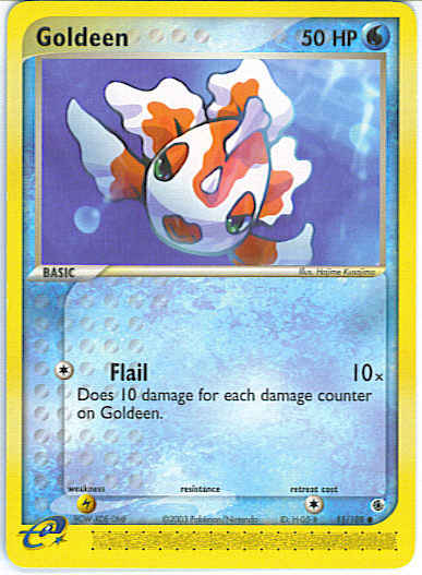 Type | Water | Pokemon serie | Ruby Sapphire | Stadie | Basic | HP | 50 | Sjældenhed | Common | Tilbagetrækning | 1 | Svaghed | L | Kortnummer | 55 | Evne | [C] Flail (10x) Does 10 damage for each damage counter on Goldeen.