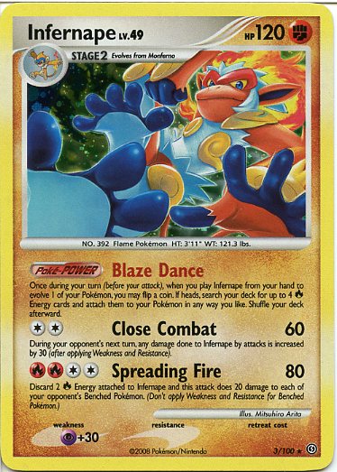 Evne [CC] Close Combat (60) During your opponent's next turn, any damage done to Infernape by attacks is increased by 30 (after applying Weakness and Resistance).