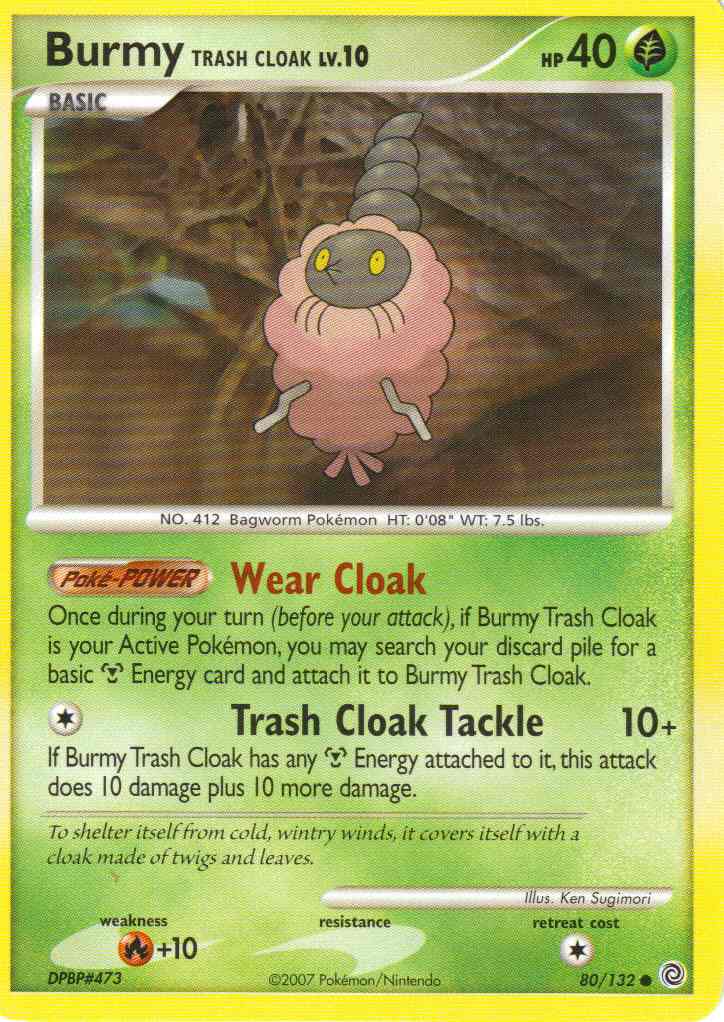 [C] Trash Cloak Tackle (10+) If Burmy Trash Cloak has any M Energy attached to it, this attack does 10 damage plus 10 more damage.
