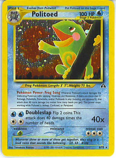 Type | Water | Pokemon serie | Neo Discovery | Stadie | Stage 2 | HP | 100 | Sjældenhed | Rare | Tilbagetrækning | 3 | Svaghed | G | Kortnummer | 8 | Evne |