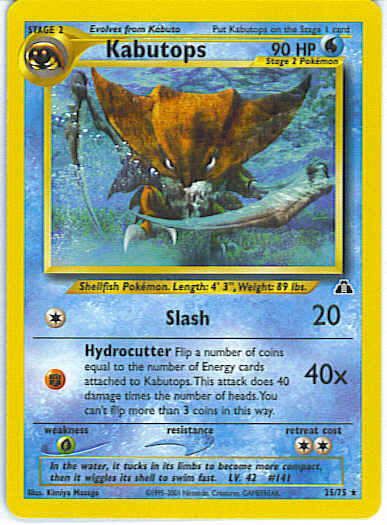 [F] Hydrocutter (40x) Flip a number of coins equal to the number of Energy cards attached to Kabutops. This attack does 40 times the number of heads. You can't flips more than 3 coins in this way.