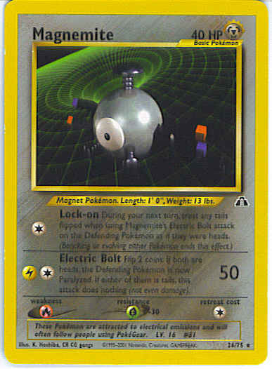 [C] Lock-on - During your next turn, treat any tails flipped when using Magnemite's Electric Bolt attack on the Defending Pokemon as if they were heads. (Benching or evolving either Pokemon ends this effect.)