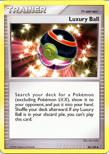 Search your deck for a Pokemon (excluding Pokemon Lv.X), show it to your opponent, and put it into your hand. Shuffle your deck afterward. If any Luxury Ball is in your discard pile, you can't play this card.