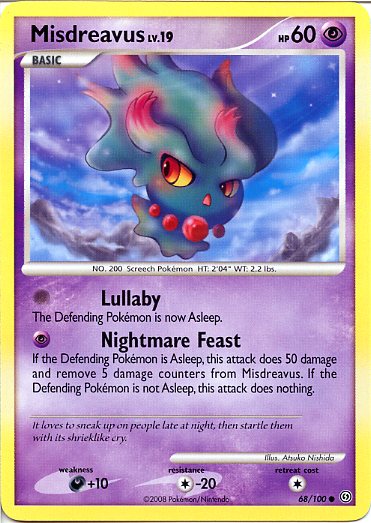 [P] Nightmare Feast - If the Defending Pokemon is Asleep, this attack does 50 damage and remove 5 damage counters from Misdreavus. If the Defending Pokemon is not Asleep, this attack does nothing.