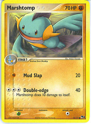 Type | Fighting | Pokemon serie | OP Series 3 | Stadie | Stage 1 | HP | 70 | Sjældenhed | Common | Tilbagetrækning | 1 | Svaghed | G | Kortnummer | 15 | Evne | [F] Mud Slap (20) [CCC] Double-edge (40) Marshtomp does 10 damage to itself.