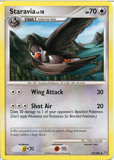 Type | Colorless | Pokemon serie | Stormfront | Stadie | Stage 1 | HP | 70.0 | Sjældenhed | Uncommon | Tilbagetrækning | 0.0 | Modstand | F-20 | Svaghed | L+20 | Kortnummer | 52 | Evne | [CC] Wing Attack (30) [CCC] Shot Air (20) Does 30 damage to 1 of your opponent's Benched Pokemon. (Don't apply Weakness and Resistance for Benched Pokemon.)