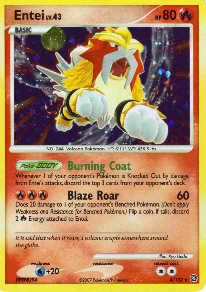 [FFF] Blaze Roar (60) Does 20 damage to 1 of your opponent's Benched Pokemon. (Doesn't apply Weakness and Resistance.) Flip a coin. If tails, discard 2 R Energy attached to Entei.