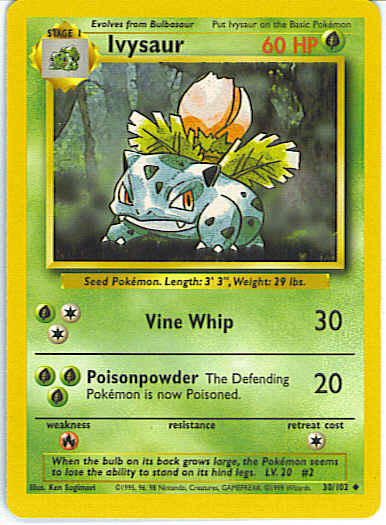Type | Grass | Pokemon serie | Base | Stadie | Stage 1 | HP | 60 | Sjældenhed | Uncommon | Tilbagetrækning | 1 | Svaghed | R | Kortnummer | 30 | Evne |