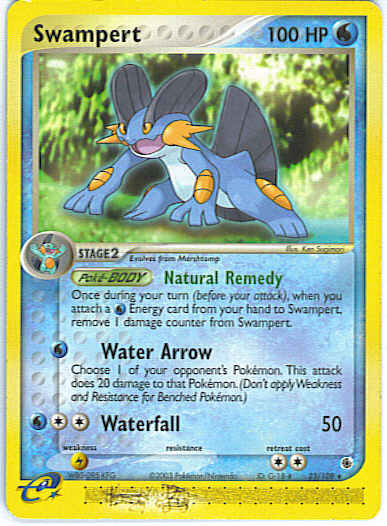 Type | Water | Pokemon serie | Ruby Sapphire | Stadie | Stage 2 | HP | 100 | Sjældenhed | Rare | Tilbagetrækning | 2 | Svaghed | L | Kortnummer | 23 | Evne | [W] Water Arrow - Choose 1 of your opponent's Pokemon. This attack does 20 damage to that Pokemon. (Don't apply Weakness and Resistance for Benched Pokemon.) [CCW] Waterfall (50)