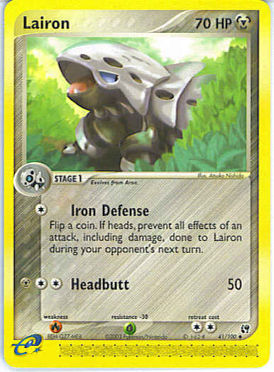 Type | Metal | Pokemon serie | Sandstorm | Stadie | Stage 1 | HP | 70 | Sjældenhed | Uncommon | Tilbagetrækning | 2 | Modstand | G | Svaghed | R | Kortnummer | 41 | Evne | [C] Iron Defense - Flip a coin. If heads, prevent all effects of an attack, including damage, done to Lairon during your opponent's next turn. [CCM] Headbutt (50)