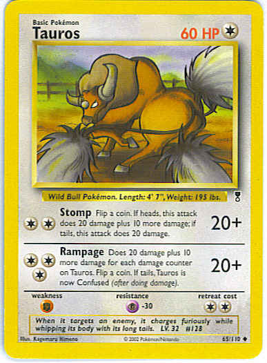 [CCC] Rampage (20+) Does 20 damage plus 10 more damage for each damage counter on Tauros. Flip a coin. If tails, Tauros is now Confused (after doing damage).