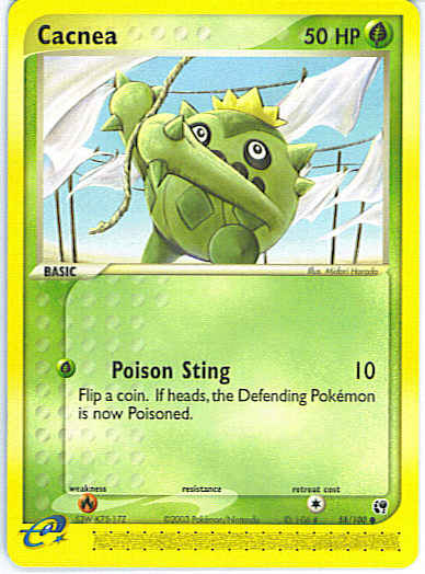 Type | Grass | Pokemon serie | Sandstorm | Stadie | Basic | HP | 50 | Sjældenhed | Common | Tilbagetrækning | 1 | Svaghed | R | Kortnummer | 58 | Evne | [C] Poison Sting (10) Flip a coin. If heads the Defending Pokemon is now Poisoned.