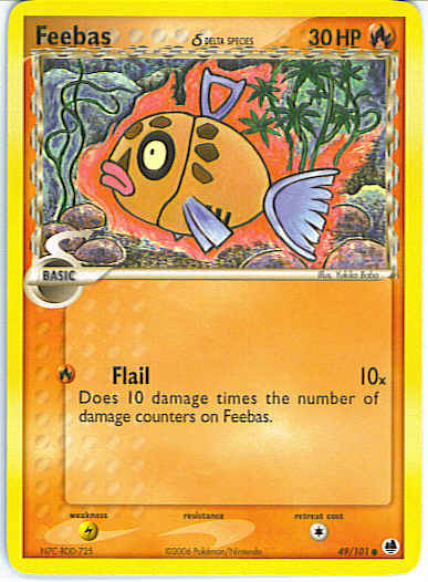 Type | Fire | Pokemon serie | Dragon Frontiers | Stadie | Basic | HP | 30 | Sjældenhed | Common | Tilbagetrækning | 1 | Svaghed | L | Kortnummer | 49 | Evne | [R] Flail (10x) Does 10 damage times the number of damage counters on Feebas.