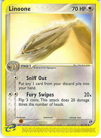 Type | Colorless | Pokemon serie | Sandstorm | Stadie | Stage 1 | HP | 70 | Sjældenhed | Uncommon | Svaghed | F | Kortnummer | 44 | Evne | [C] Sniff Out - Put any 1 card from your discard pile into your hand. [CC] Fury Swipes (20x) Flip 3 coins. This attack does 20 damage times the number of heads.