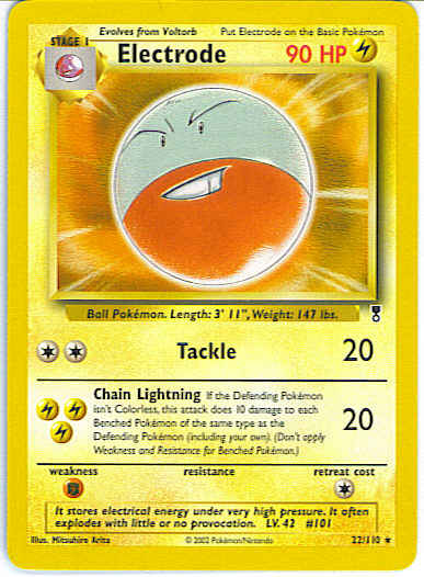 Type | Lightning | Pokemon serie | Legendary Collection | Stadie | Stage 1 | HP | 90 | Sjældenhed | Rare | Tilbagetrækning | 1 | Svaghed | F | Kortnummer | 22 | Evne |