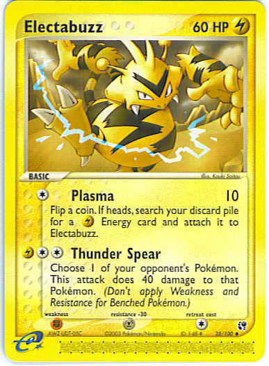 Type | Lightning | Pokemon serie | Sandstorm | Stadie | Basic | HP | 60 | Sjældenhed | Uncommon | Tilbagetrækning | 1 | Modstand | M | Svaghed | F | Kortnummer | 35 | Evne | [C] Plasma - Flip a coin. If heads, search your discard pile for a L Energy card and attach it to Electabuzz. [CCL] Thunder Spear (40) Choose 1 of your opponent's Pokemon. This attack does 40 damage to that Pokemon. (Don't apply Weakness and Resistance for Benched Pokemon.)