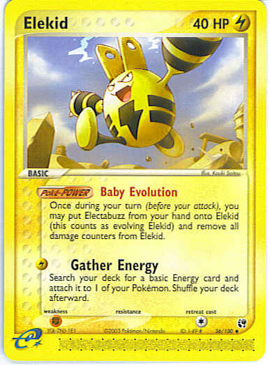 Type | Lightning | Pokemon serie | Sandstorm | Stadie | Basic | HP | 40 | Sjældenhed | Uncommon | Tilbagetrækning | 1 | Svaghed | F | Kortnummer | 36 | Evne | [L] Gather Energy - Search your deck for a basic Energy card and attach it to 1 of your Pokemon. Shuffle your deck afterward.