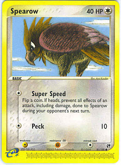 | Evne2 | [C] Super Speed - Flip a coin. If heads, prevent all effects of an attack, including damage, done to Spearow during your opponent's next turn. [C] Peck (10)