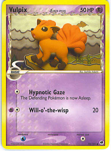 Type | Psychic | Pokemon serie | Dragon Frontiers | Stadie | Basic | HP | 50 | Sjældenhed | Common | Tilbagetrækning | 1 | Svaghed | W | Kortnummer | 70 | Evne | [C] Hypnotic Gaze - The Defending Pokemon is now Asleep. [CP] Will-o'-the-wisp (20)