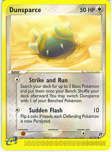 Evne[C] Strike and Run - Search your deck for up to 3 Basic Pokemon and put them onto your Bench. Shuffle your deck afterward. You may switch Dunsparce with 1 of your Benched Pokemon.