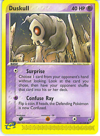 Type | Psychic | Pokemon serie | Sandstorm | Stadie | Basic | HP | 40 | Sjældenhed | Common | Tilbagetrækning | 1 | Modstand | F | Svaghed | D | Kortnummer | 61 | Evne | [C] Surprise - Choose 1 card from your opponent's hand without looking. Look at the card you chose, then have your opponent shuffle that card into his or her deck. [P] Confuse Ray - Flip a coin. If heads, the Defending Pokemon is now Confused.